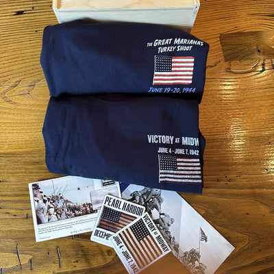 WWII Victory in the Pacific Gift Box with "Victory at Midway" Shirt and "The Great Marianas Turkey Shoot" Shirt along with stickers and bookmarks