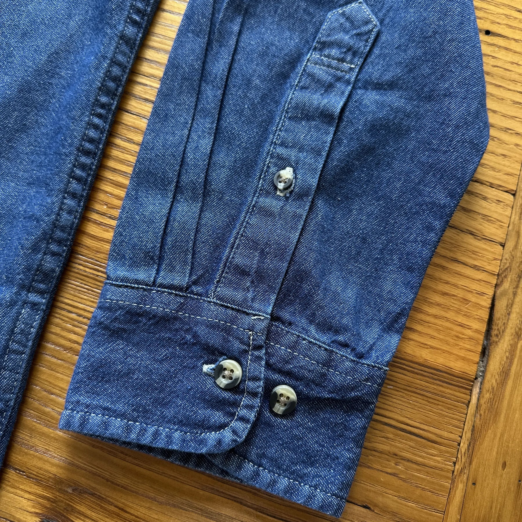 • Embroidered in New England on a 100% cotton denim long-sleeved button-down shirt. Features a pocket on the left chest and a button-down collar.