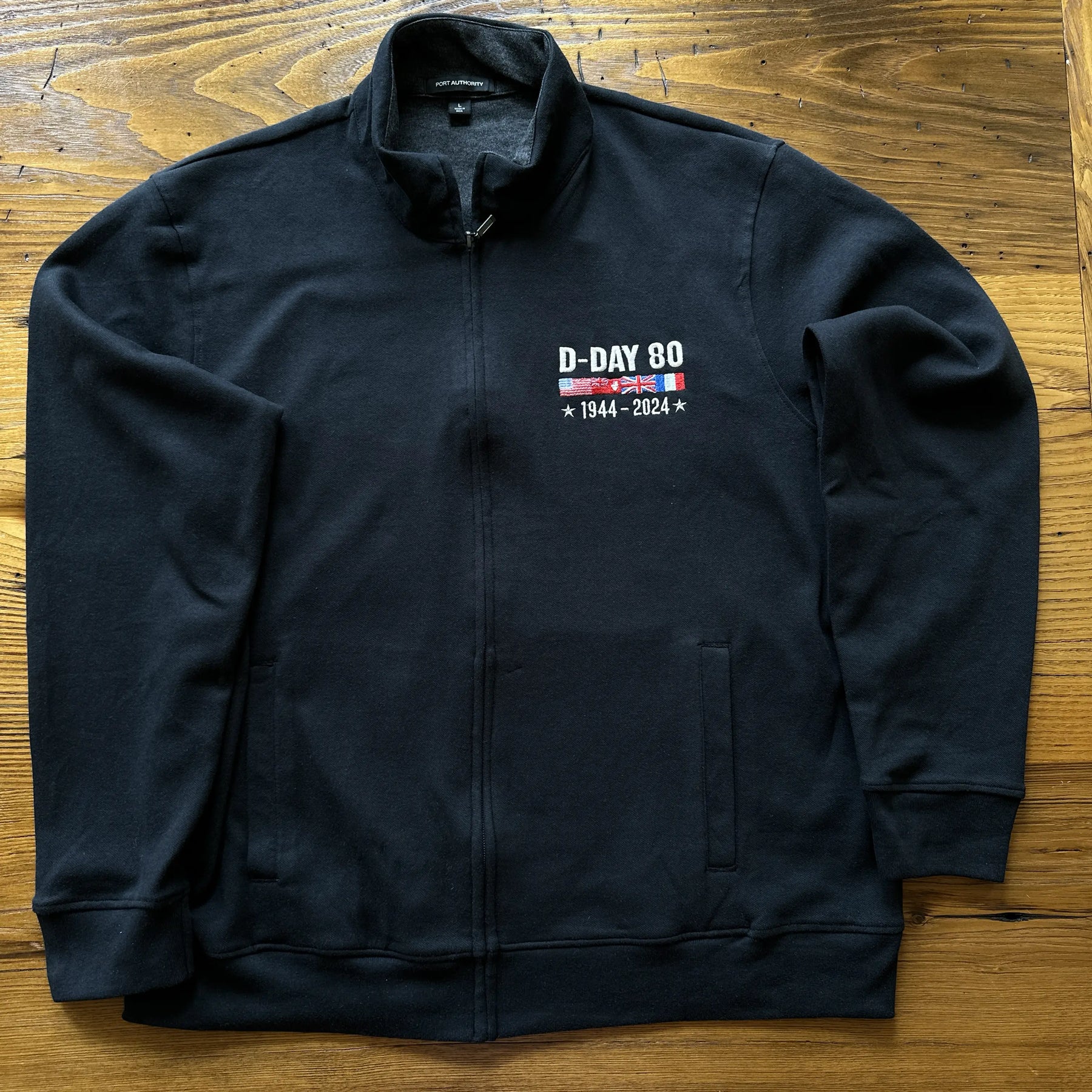 Embroidered over the left chest, "D-Day 80," the flags of the major allied nations involved in the landing, and the years 1944 - 2024.  (There is nothing on the back.)