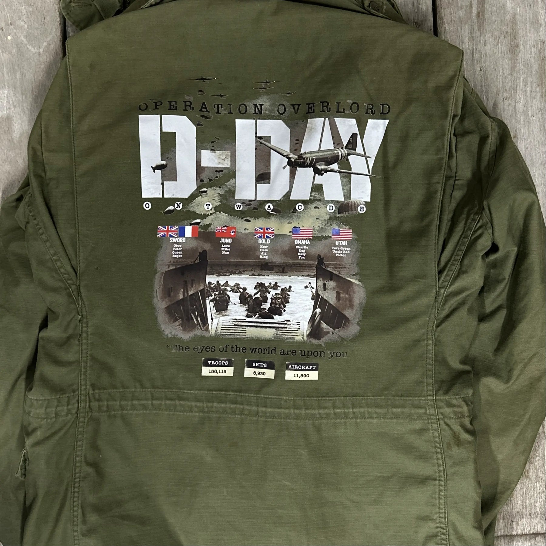 M65 Army field coats with original D-Day Operation Overlord design and a 48-star flag