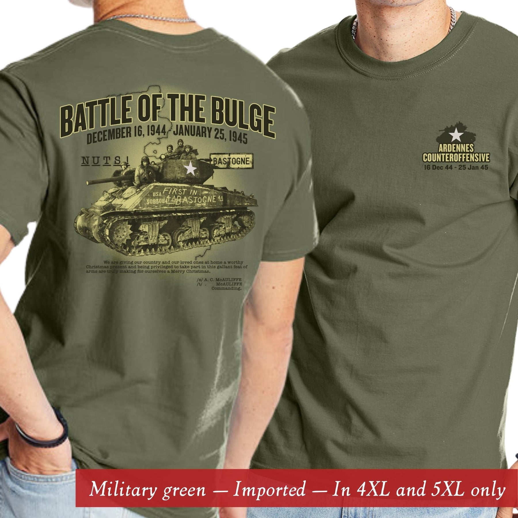 A note on Made in America: We are working to use only Made in America shirts for our Battle of the Bulge design (as well as many other designs). We are also working to expand our size range up to 5X. Because the Made in America line of shirts we use for standard Military Green doesn't have sizes above 3XL, we have to use an imported shirt for 4XL and 5XL, and the Vintage Green is only available up to 3XL and only on an imported shirt.