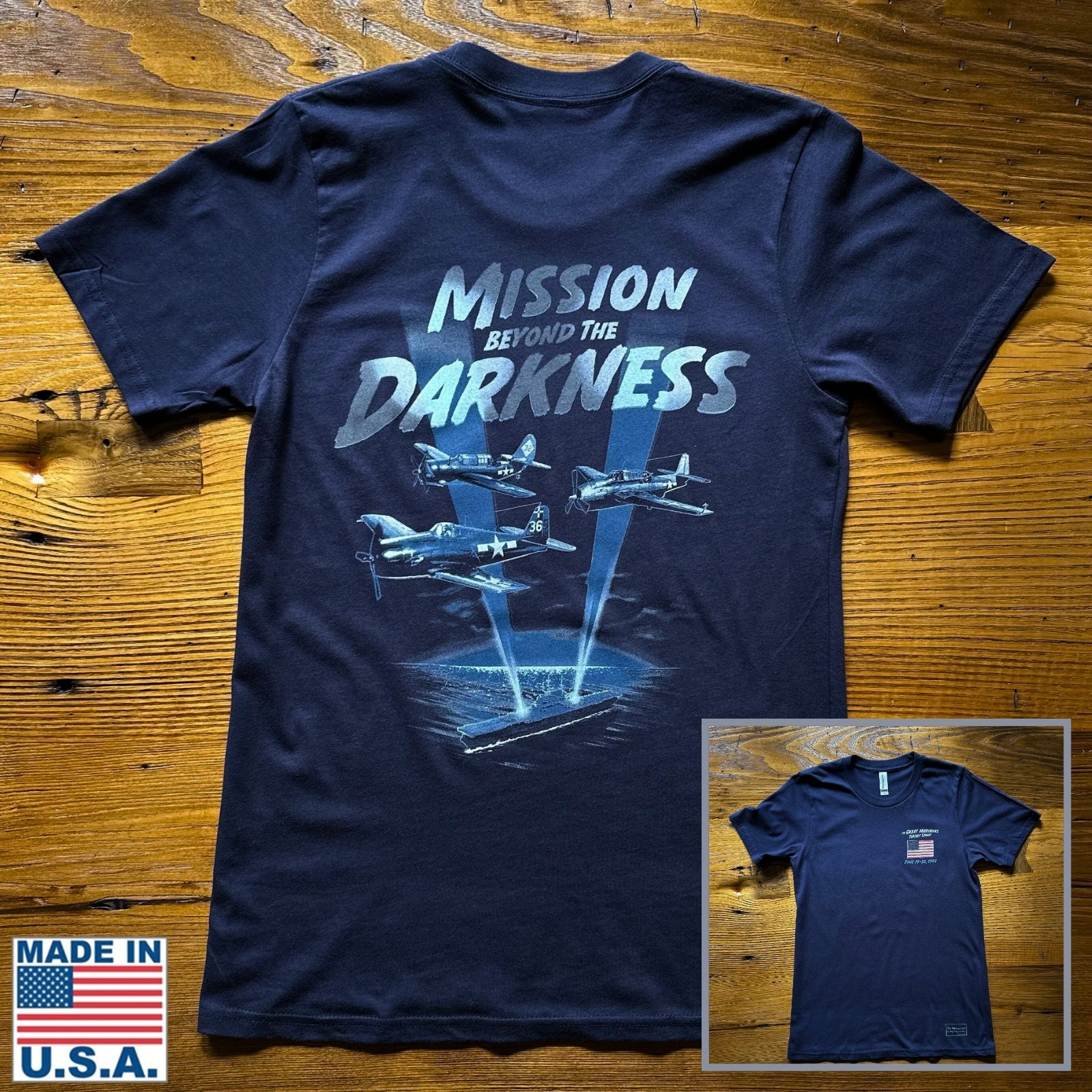 "The Great Marianas Turkey Shoot — Mission Beyond the Darkness" Made in America Shirt — Recognizes the The Great Marianas Turkey Shoot on June 19-20, 1944, the “greatest carrier battle of the war” resulting in the destruction of the naval air power of Japan and a full retreat for the defeated Admiral Ozawa.